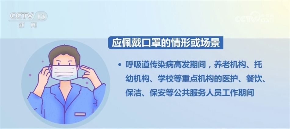 《指引》明確,應(yīng)佩戴口罩的情形或場景包括:新冠病毒感染、流感、肺炎支原體感染、呼吸道合胞病毒感染等呼吸道傳染病感染者前往室內(nèi)公共場所或與他人近距離接觸時(shí)。出現(xiàn)發(fā)熱、咳嗽、流涕、咽痛、肌肉酸痛、乏力等呼吸道傳染病癥狀者前往室內(nèi)公共場所或與他人近距離接觸時(shí)。前往醫(yī)療機(jī)構(gòu)就診、陪診、陪護(hù)、探視時(shí)。呼吸道傳染病高發(fā)期間,外來人員進(jìn)入養(yǎng)老機(jī)構(gòu)、社會(huì)福利機(jī)構(gòu)、托幼機(jī)構(gòu)等脆弱人群集中場所時(shí)。呼吸道傳染病高發(fā)期間,養(yǎng)老機(jī)構(gòu)、托幼機(jī)構(gòu)、學(xué)校等重點(diǎn)機(jī)構(gòu)的醫(yī)護(hù)、餐飲、保潔、保安等公共服務(wù)人員工作期間。