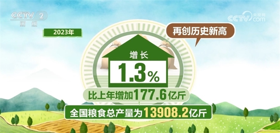 國家統(tǒng)計局今天(12月11日)發(fā)布的數(shù)據(jù)顯示,2023年,全國糧食總產(chǎn)量為13908.2億斤,比上年增長1.3%,全年糧食產(chǎn)量再創(chuàng)歷史新高。