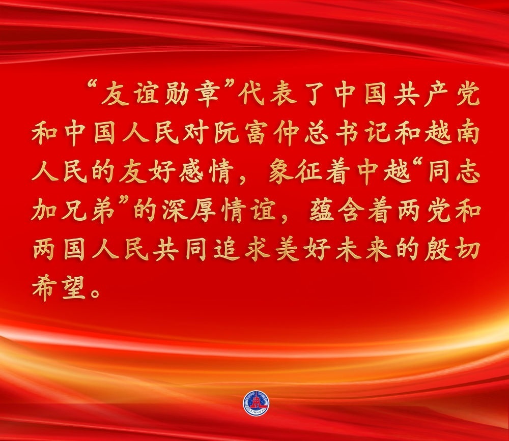 2022年10月31日,中共中央總書(shū)記、國(guó)家主席習(xí)近平在北京人民大會(huì)堂向越共中央總書(shū)記阮富仲授予中華人民共和國(guó)“友誼勛章”,并舉行隆重頒授儀式。