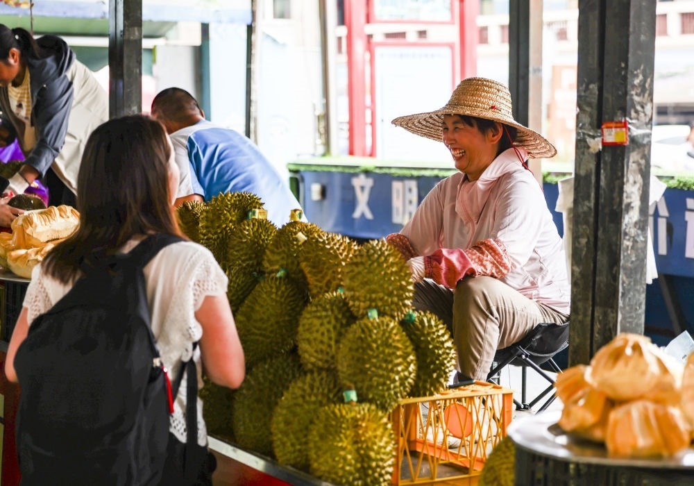 2023年5月18日,越南果商在中國(guó)廣西東興售賣(mài)榴蓮。