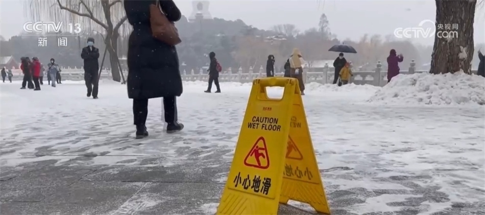 北海公園信息傳媒科副科長 張磊:主要是在門區(qū)、洗手間以及重點(diǎn)的景區(qū),同時我們也設(shè)置了“小心地滑”的這種提示牌130余處,此次降雪時間由于比較長,公園也采用了“機(jī)械+人工掃雪”的這種方式,爭取做到了隨掃隨清,保證主路的暢通。