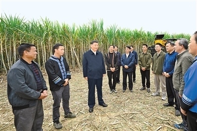 14日下午,習(xí)近平到來賓市考察調(diào)研。在國家現(xiàn)代農(nóng)業(yè)產(chǎn)業(yè)園黃安優(yōu)質(zhì)“雙高”糖料蔗基地,習(xí)近平察看萬畝甘蔗林和機(jī)械化作業(yè)收割場景,聽取基地情況介紹。他走進(jìn)甘蔗林,詳細(xì)了解甘蔗良種繁育技術(shù)要領(lǐng),同蔗農(nóng)、農(nóng)機(jī)手和農(nóng)技人員親切交流。習(xí)近平指出,廣西是我國蔗糖主產(chǎn)區(qū),要把這一特色優(yōu)勢產(chǎn)業(yè)做強(qiáng)做大,為保障國家糖業(yè)安全、促進(jìn)蔗農(nóng)增收致富發(fā)揮更大作用。要積極培育和推廣良種、提高機(jī)械化作業(yè)水平,建設(shè)好現(xiàn)代農(nóng)業(yè)產(chǎn)業(yè)園。要探索建立更加穩(wěn)定的利益聯(lián)結(jié)機(jī)制,讓廣大農(nóng)民共享農(nóng)村改革和發(fā)展成果。他祝愿鄉(xiāng)親們的生活像甘蔗一樣甜蜜。