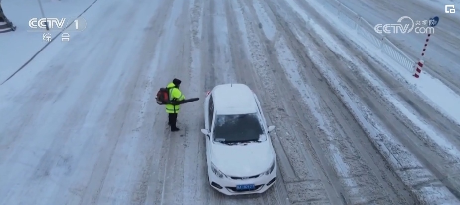 交警身背吹風(fēng)設(shè)備 路口吹去車上積雪
