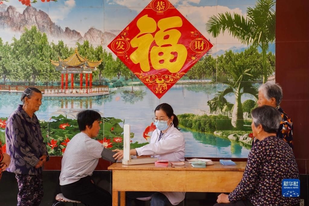 河北省平鄉(xiāng)縣尋召村村醫(yī)在“幸福小院”內(nèi)為老人們量血壓(2023年4月20日攝)。近年來,河北省平鄉(xiāng)縣利用農(nóng)村閑置院落,按照“就近集中、鄰里互助、抱團(tuán)養(yǎng)老”的模式,采取社會捐助、鄉(xiāng)村籌集、縣財(cái)政補(bǔ)助等形式,先后打造出300余個(gè)“幸福小院”。新華社記者 牟宇 攝