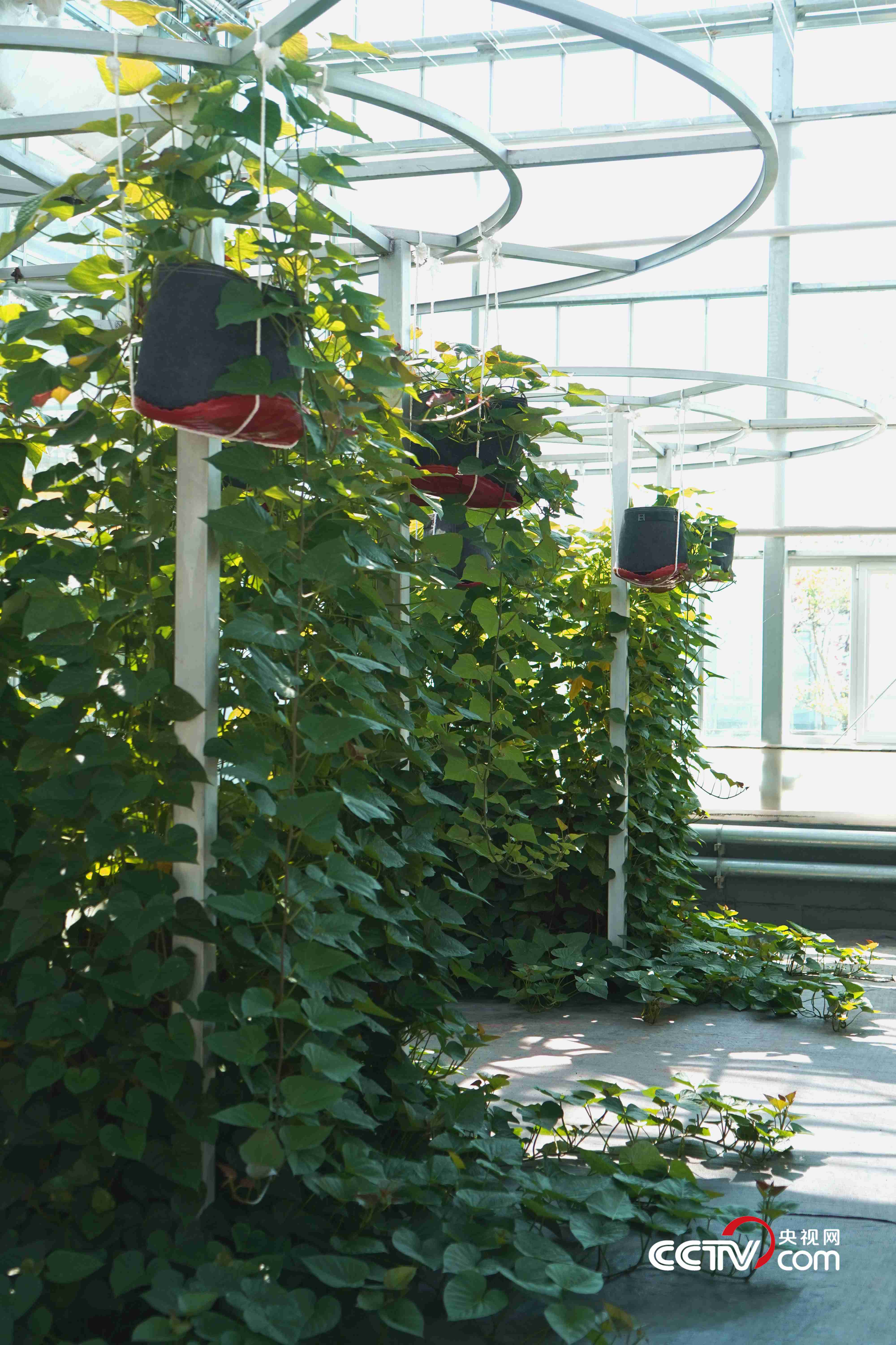 空中紅薯則利用深液流栽培模式,將紅薯由傳統(tǒng)的土壤栽培轉變?yōu)樗耘嗟哪J?。陸璐表示,其特點體現(xiàn)在水生根系能為植株提供充足的水肥,壓蔓產生的不定根成為儲藏根,實現(xiàn)了根系的分工合作,能夠達到一年種植多年采收的效果?!皳y算,單株冠幅在60平方米的‘紅薯樹’一年可產1200多斤的紅薯?!边@種栽培模式不僅能帶來經濟效益,在農業(yè)觀光、科普教育方面也有獨特價值。