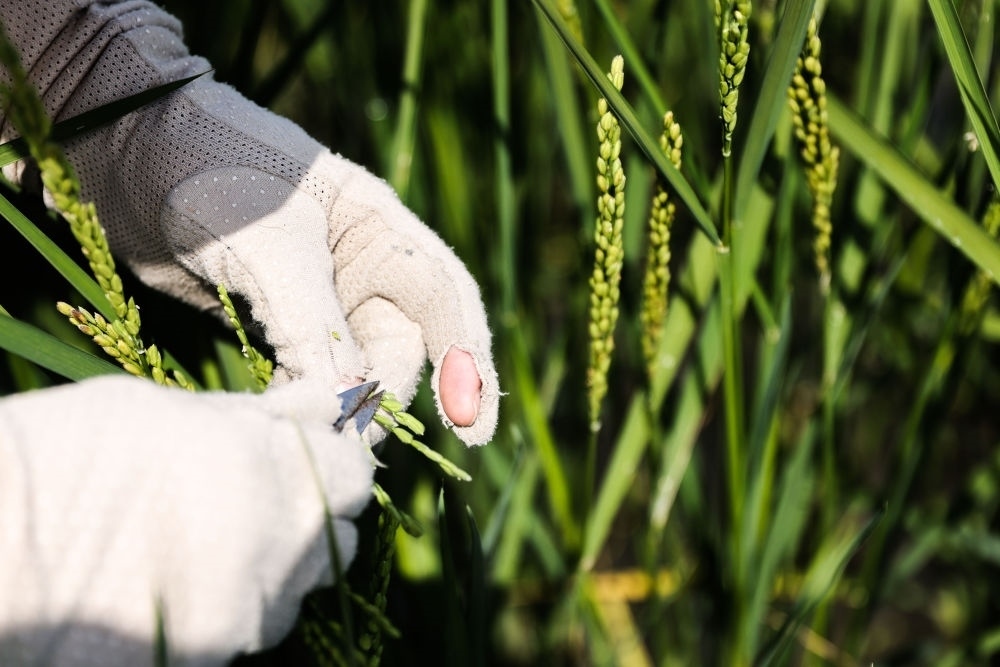 2023年2月22日,青島海水稻研究發(fā)展中心的科研人員于萌在三亞的國(guó)家南繁科研育種基地里做水稻雜交實(shí)驗(yàn)。新華社記者 張麗蕓 攝