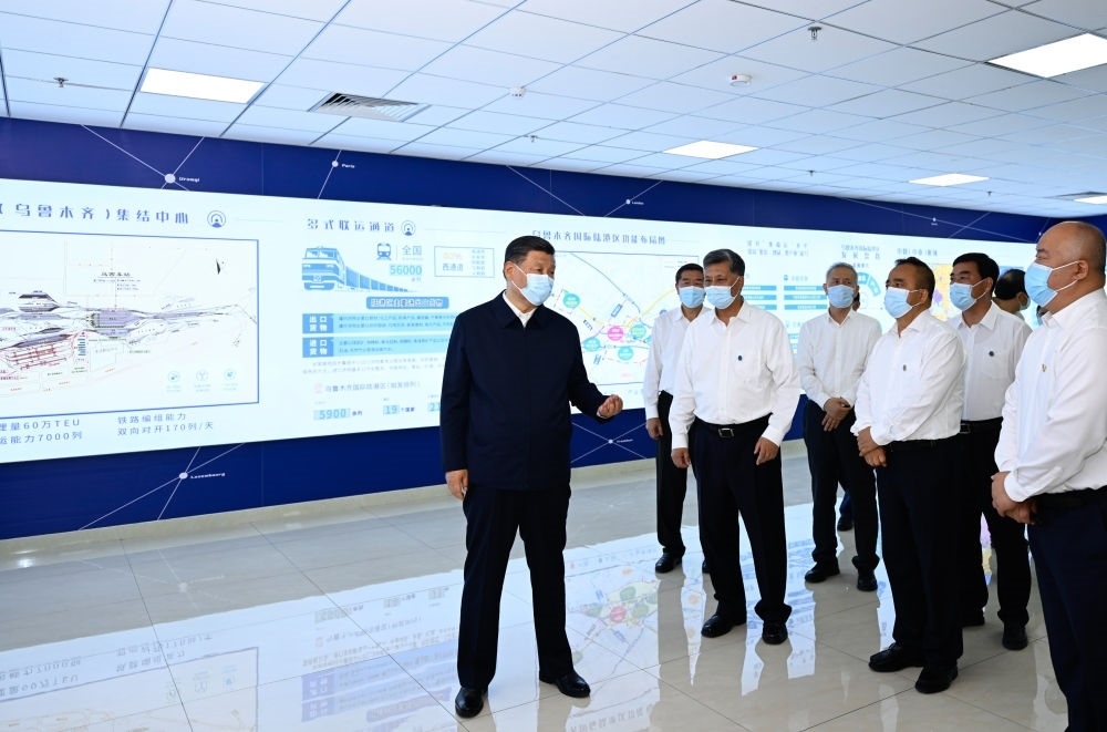 2022年7月12日下午,習(xí)近平在新疆烏魯木齊國(guó)際陸港區(qū)考察。