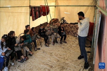 受新一輪巴以沖突影響,加沙地帶許多學(xué)校被用來(lái)收留無(wú)家可歸的民眾,學(xué)生們只能在臨時(shí)搭建的教室中學(xué)習(xí)。