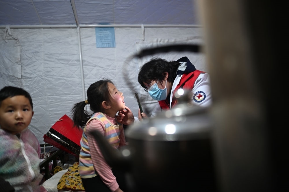 在青海省海東市民和回族土族自治縣官亭鎮(zhèn)喇家村安置點,山東援青醫(yī)生李鴻皓(右)為喇生婷檢查身體(12月23日攝)。積石山6.2級地震發(fā)生以來,在青海省海東市民和回族土族自治縣,當?shù)蒯t(yī)療機構(gòu)和援青醫(yī)療隊通過設(shè)立醫(yī)療點、開展巡診等方式保障安置點群眾就醫(yī)服務(wù),守護群眾健康。新華社記者 張宏祥 攝