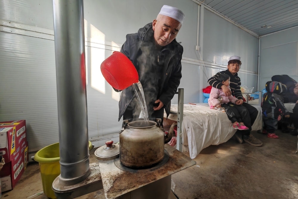 在甘肅臨夏積石山縣大河家鎮(zhèn)梅坡村活動板房安置點,受災(zāi)村民在活動板房內(nèi)的火爐上燒水(12月21日攝)。新華社記者 范培珅 攝