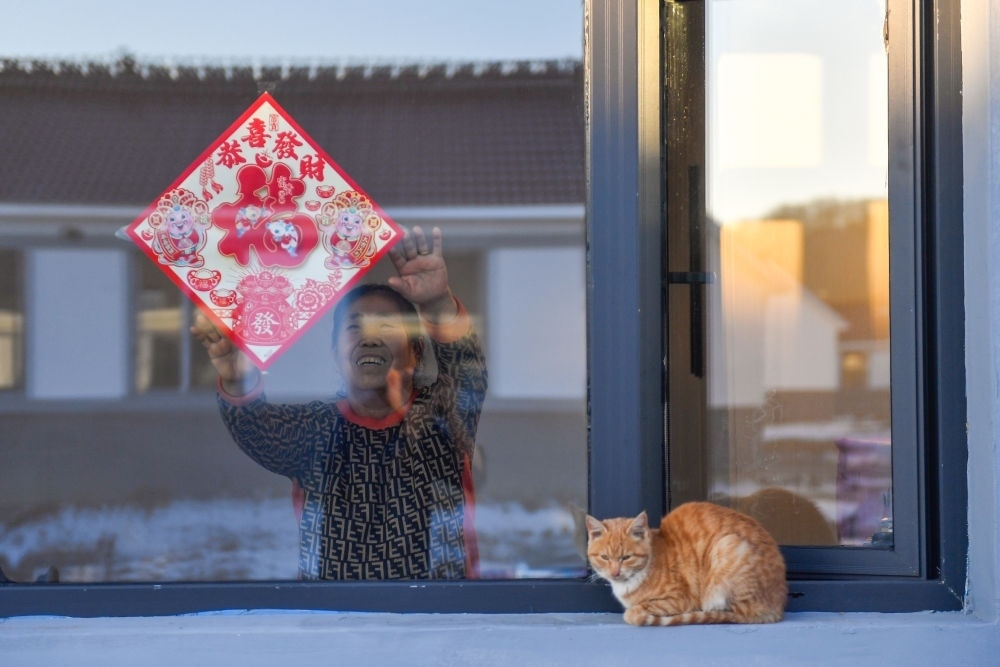 吉林省舒蘭市開原鎮(zhèn)新開村村民徐中仁在新房子中貼“?!弊郑?2月7日攝)。新華社記者 許暢 攝