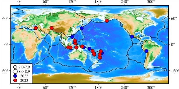 2023年95%的全球7級(jí)以上地震發(fā)生在歐亞地震帶和澳大利亞板塊東北邊界。其中歐亞地震帶發(fā)生7級(jí)以上地震7次,澳大利亞板塊東北邊界發(fā)生7級(jí)以上地震11次。