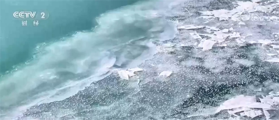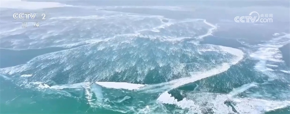 從空中俯瞰,金色的沙灘、潔白的冰線、剔透的碎冰以及蔚藍(lán)的湖面,共同構(gòu)成一幅色彩明艷的線條畫。