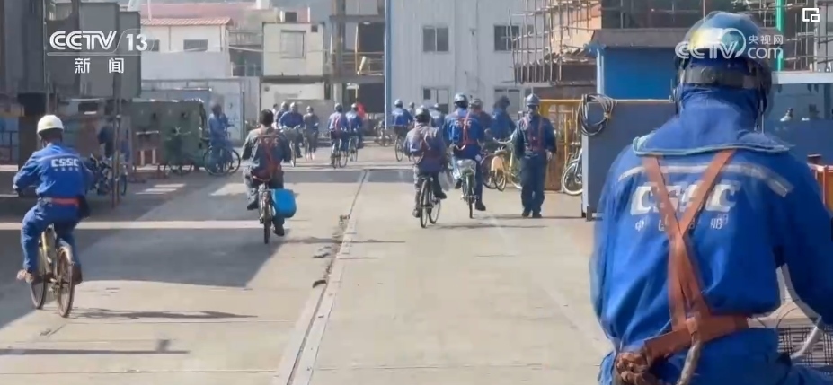 一輛輛各式各樣的自行車平穩(wěn)穿梭在安全區(qū),車上的工友有事兒就會(huì)互相召喚,拿出圖紙解決問(wèn)題,互通有無(wú)。而在職工和船東餐廳里,一張張餐桌上分區(qū)標(biāo)記了各個(gè)業(yè)主單位。吃完飯撤掉餐具,大家就開始“頭腦風(fēng)暴”,現(xiàn)場(chǎng)辦公。