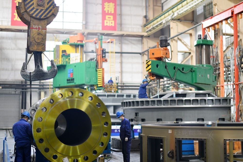 工人在哈電集團(tuán)哈爾濱電機(jī)廠(chǎng)有限責(zé)任公司生產(chǎn)車(chē)間作業(yè)(2023年4月11日攝)。新華社記者 王建威 攝