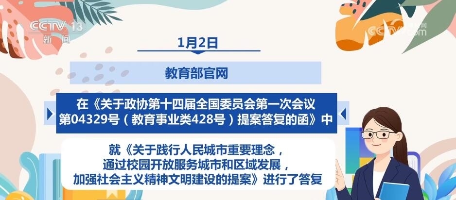 1月2日,教育部官網在《關于政協(xié)第十四屆全國委員會第一次會議第04329號(教育事業(yè)類428號)提案答復的函》中,就《關于踐行人民城市重要理念,通過校園開放服務城市和區(qū)域發(fā)展,加強社會主義精神文明建設的提案》進行了答復。