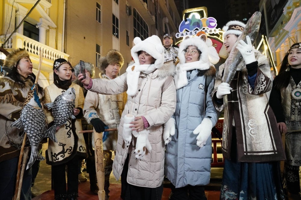 ↑1月6日,身著赫哲族服飾的赫哲族群眾在哈爾濱中央大街上與游客互動(dòng)。