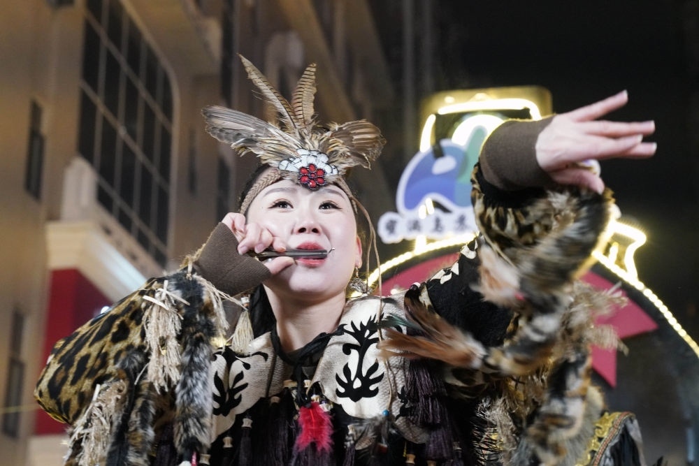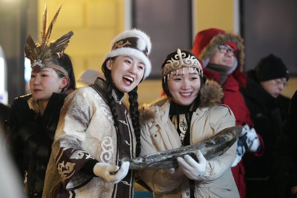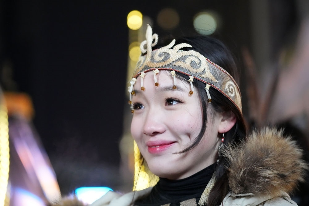 ↑1月6日,戴著魚皮頭飾的赫哲族姑娘在哈爾濱中央大街上參與家鄉(xiāng)推介活動(dòng)。