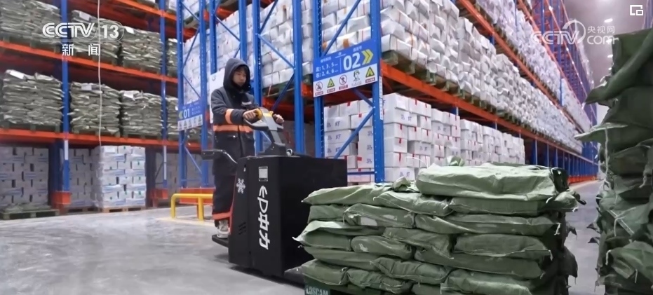 在浙江長(zhǎng)興的一家企業(yè)廠房里,廠家工作人員根據(jù)訂單快速分發(fā)、貼單、裝貨;快遞小哥則在一樓出貨區(qū),將叉車(chē)上的貨物運(yùn)上郵政貨車(chē)。