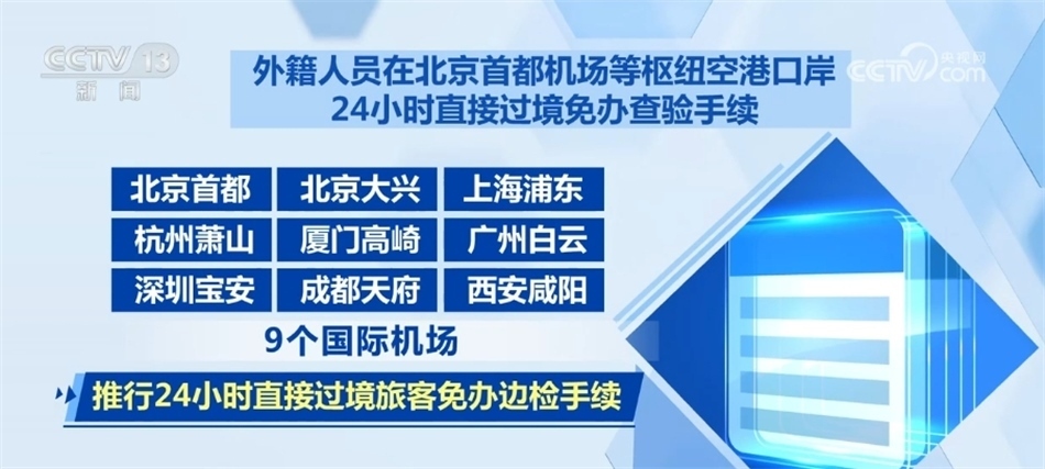 外籍人員在北京首都機(jī)場(chǎng)等樞紐空港口岸24小時(shí)直接過境免辦查驗(yàn)手續(xù)。在北京首都、北京大興、上海浦東、杭州蕭山、廈門高崎、廣州白云、深圳寶安、成都天府、西安咸陽9個(gè)國際機(jī)場(chǎng),推行24小時(shí)直接過境旅客免辦邊檢手續(xù)。對(duì)于持24小時(shí)內(nèi)國際聯(lián)程機(jī)票,經(jīng)上述任一機(jī)場(chǎng)過境前往第三國或地區(qū)的出入境旅客,可以免辦邊檢手續(xù),直接免簽過境。