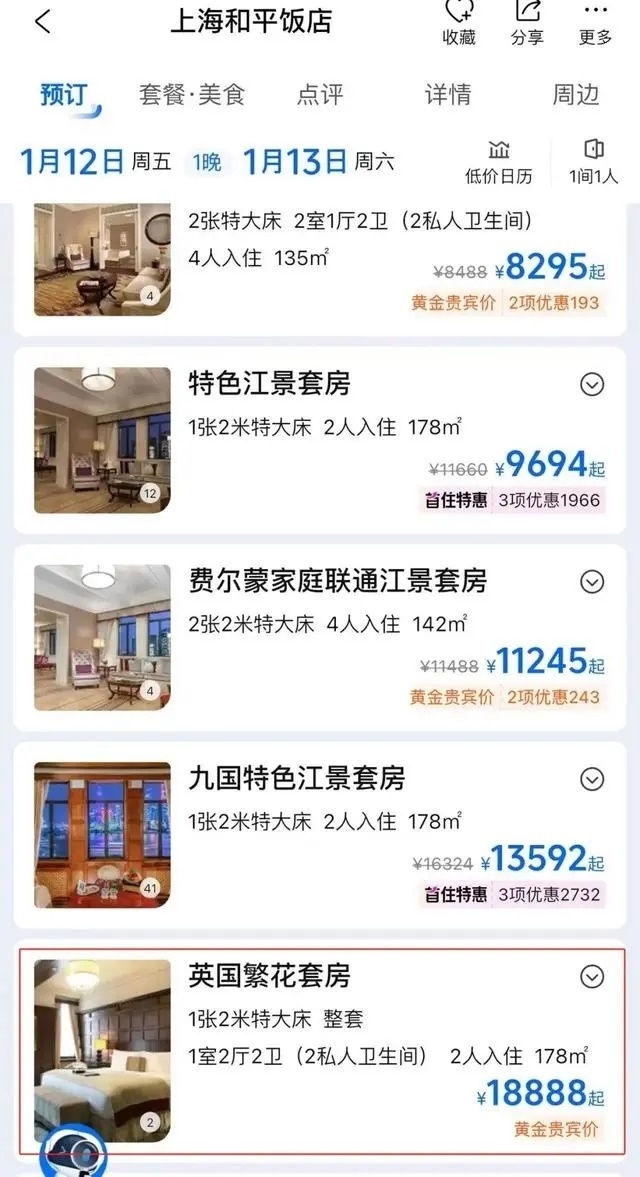 劇中出鏡率極高的和平飯店英國套房也成了“熱門產品”。目前,和平飯店英國套房在旅游平臺上被命名為“英國繁花套房”。9日查詢攜程旅行平臺發(fā)現,9-11日該套房已售罄,12日入住一晚的價格為18888元。據媒體此前報道,這一套房在今年春節(jié)期間含早價為22888元一晚。