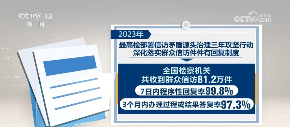 2023年,最高檢部署信訪矛盾源頭治理三年攻堅(jiān)行動(dòng),深化落實(shí)群眾信訪件件有回復(fù)制度。全國(guó)檢察機(jī)關(guān)共收到群眾信訪81.2萬(wàn)件,7日內(nèi)程序性回復(fù)率99.8%,3個(gè)月內(nèi)辦理過(guò)程或結(jié)果答復(fù)率97.3%。