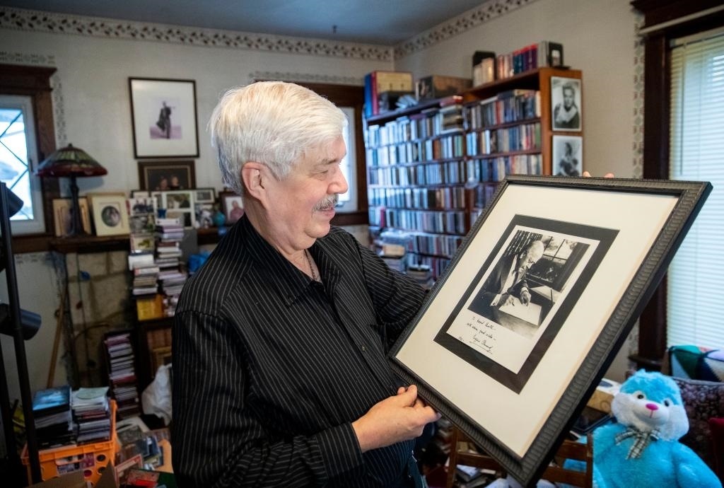 2019年1月29日,達(dá)維德·布思在位于美國新澤西的家中展示曾率費(fèi)城交響樂團(tuán)到中國首演的指揮尤金·奧曼迪的照片。