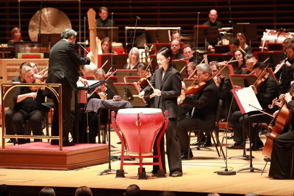 1月12日,在美國費(fèi)城,上海交響樂團(tuán)打擊樂演奏家付藝霏(中)在2024年費(fèi)城交響樂團(tuán)新春音樂會上演出。