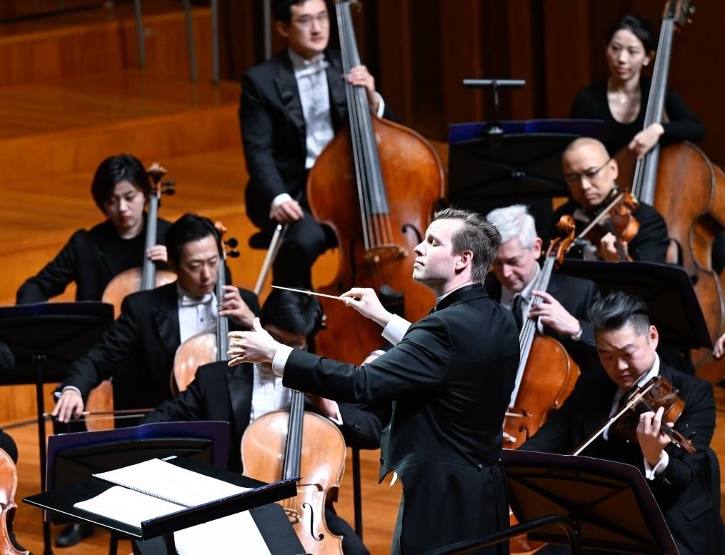 1月12日,在美國費(fèi)城,中國指揮家余?。ㄖ校┰?024年費(fèi)城交響樂團(tuán)新春音樂會上指揮。