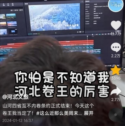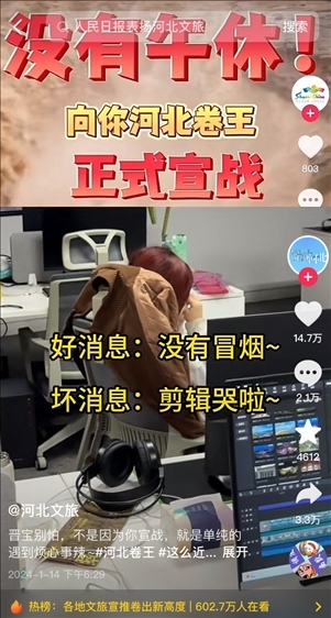 有網(wǎng)友建議賬號改名為“河北文旅”,“不然都搜不到”,“聽勸”的官方賬號火速改名,并發(fā)布視頻“宣戰(zhàn)”,“山河四省互不內(nèi)卷?xiàng)l約正式結(jié)束,今天這個(gè)卷王我當(dāng)定了”,于是開始“瘋狂輸出”,日更75條,可還了得?