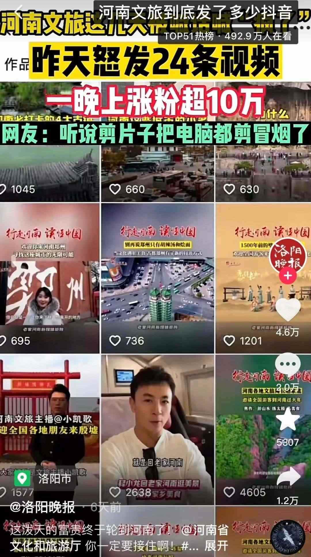 有人統(tǒng)計(jì),自1月9日起,河南文旅官方賬號“河南省文化和旅游廳”每天發(fā)布二三十條視頻,連續(xù)四天發(fā)布了112條視頻,持續(xù)展示本地文旅資源,吸引了近百萬新粉絲,主打一個(gè)“量變總會(huì)引起質(zhì)變”,以至于“河南文旅到底發(fā)了多少抖音”相關(guān)話題成為熱門搜索。