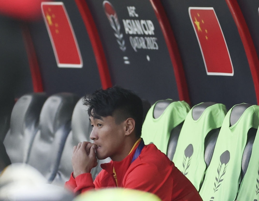 1月13日,中國隊(duì)對陣塔吉克斯坦隊(duì),圖為因傷未能進(jìn)入名單的韋世豪賽前在替補(bǔ)席上。新華社記者 曹燦 攝