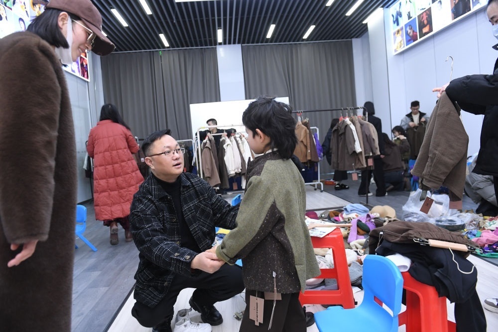 2024年1月17日,在位于浙江省湖州市織里鎮(zhèn)的萬順服飾股份有限公司,工作人員(前左二)在品牌的2024秋季新品審版會后臺和小模特交流??椑镦?zhèn)是中國最大的童裝產(chǎn)業(yè)集群地,聚集著1.4萬家童裝企業(yè)。新華社記者 翁忻旸 攝