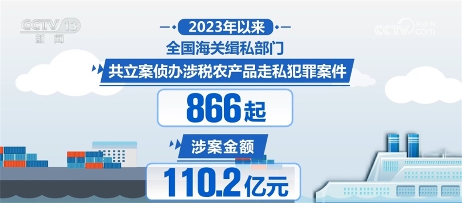 針對(duì)農(nóng)產(chǎn)品走私問(wèn)題,海關(guān)緝私部門(mén)加大打擊凍品、煙草、水果、食糖、糧食等農(nóng)產(chǎn)品走私力度,推動(dòng)強(qiáng)化對(duì)運(yùn)輸、倉(cāng)儲(chǔ)、銷(xiāo)售環(huán)節(jié)的清查整治。2023年以來(lái),共立案?jìng)赊k涉稅農(nóng)產(chǎn)品走私犯罪案件866起,涉案金額110.2億元。