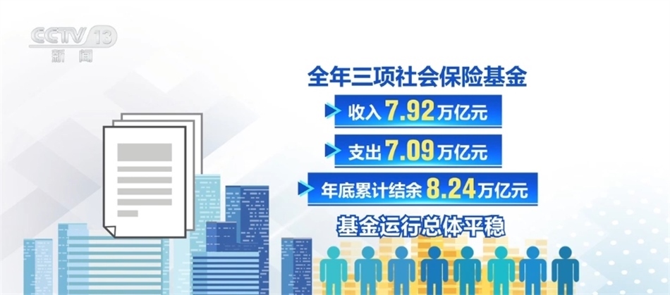 截至2023年底,我國基本養(yǎng)老、失業(yè)、工傷保險參保人數(shù)分別為10.66億人、2.44億人、3.02億人,同比增加1336萬人、566萬人、1054萬人。全年三項社會保險基金收入7.92萬億元,支出7.09萬億元,年底累計結(jié)余8.24萬億元,基金運行總體平穩(wěn)。