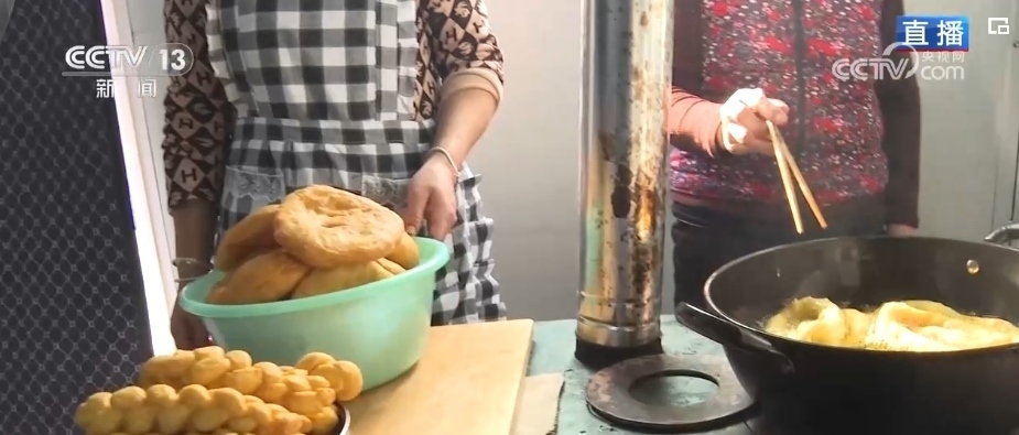 炸年饃是當(dāng)?shù)赝磷迦罕娪哟汗?jié)的傳統(tǒng)習(xí)俗。一家人齊上陣,這邊兩位大姐正在將發(fā)好的面揉好、揪出面劑子、搟成圓形、表面抹上清油,放進(jìn)油鍋里炸熟。對于土族群眾來說,進(jìn)入臘月之后就開始做年饃、宰年豬、置辦年貨,年味兒就濃了。炸年饃是當(dāng)?shù)厝罕娖碓感碌囊荒觑L(fēng)調(diào)雨順、五谷豐登、平安順?biāo)斓拿篮迷⒁狻V谱髂牮x的面粉、菜籽油等材料都是政府給受災(zāi)群眾提供的物資。