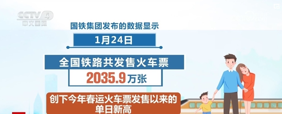 國鐵集團(tuán)發(fā)布的數(shù)據(jù)顯示,1月24日,全國鐵路共發(fā)售火車票2035.9萬張,創(chuàng)下2024年春運(yùn)火車票發(fā)售以來的單日新高,這標(biāo)志著節(jié)前售票高峰已經(jīng)到來。