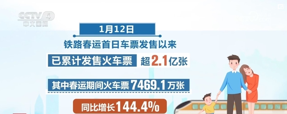 自1月12日鐵路春運(yùn)首日車票發(fā)售以來,已累計(jì)發(fā)售火車票超2.1億張。其中,春運(yùn)期間火車票7469.1萬張,同比增長144.4%。為滿足旅客旺盛的出行需求,全國鐵路統(tǒng)籌新線與既有線路、高鐵與普速鐵路,啟用春運(yùn)列車運(yùn)行圖,加大客運(yùn)能力投放。
