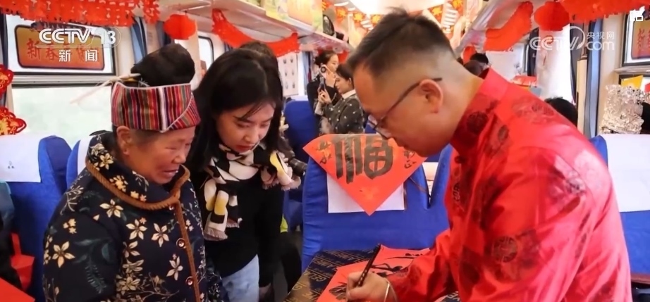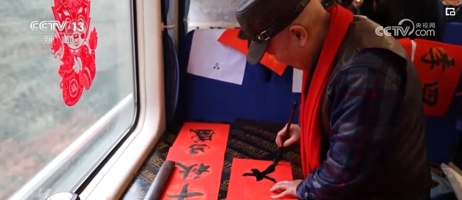 春節(jié)臨近,列車的車廂裝扮一新。鐵路部門還邀請(qǐng)了書法愛好者給旅客們寫春聯(lián)、送福字,為大家送出新春祝福。