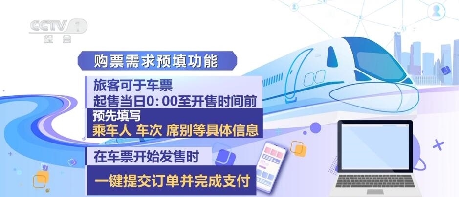 鐵路部門今年還增加了購票需求預(yù)填功能,旅客可于車票起售當(dāng)日0:00至開售時(shí)間前,預(yù)先填寫乘車人、車次、席別等具體信息,在車票開始發(fā)售時(shí)一鍵提交訂單并完成支付。