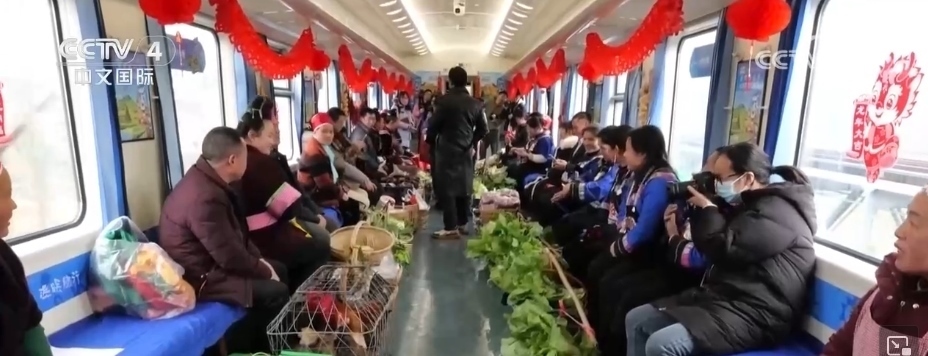 在貴州,有一趟往返于貴陽與玉屏之間的“慢火車”5640次列車,里面專設(shè)了一個(gè)農(nóng)特產(chǎn)品車廂。新春臨近,村民們將自家養(yǎng)殖的土雞、雞蛋,熏制的香腸、臘肉,以及水果、蔬菜帶上列車,向旅客現(xiàn)場(chǎng)售賣。