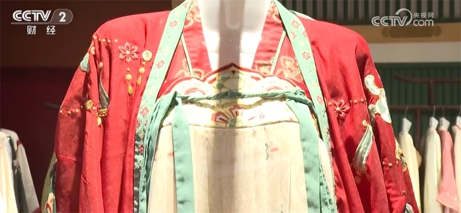 總臺記者 秦祎:我旁邊的這件就是店內(nèi)最受歡迎的唐裝之一——花想容,這件衣服里面是一件唐裝的基礎(chǔ)款造型齊胸襦裙,披上外披則是貴妃造型,如果擔(dān)心天氣冷可以像我一樣加上斗篷。