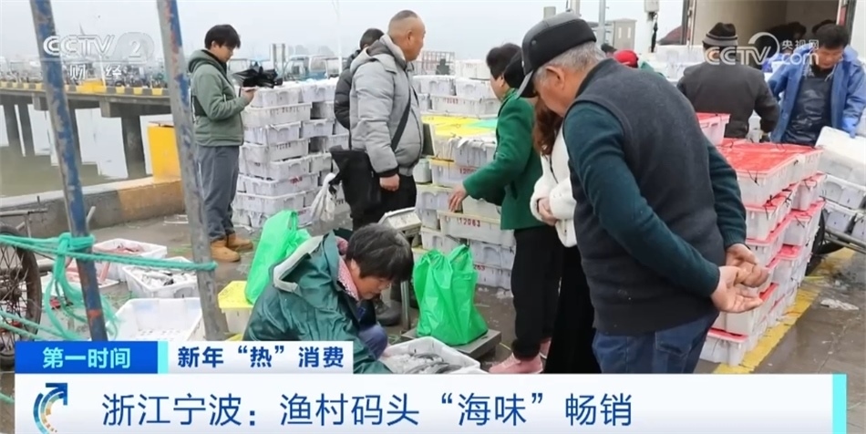 浙江寧波奉化區(qū)莼湖街道的漁村碼頭也進入了年前最后的繁忙時刻。上午八點,5艘運輸船??吭趦?nèi)外碼頭上,據(jù)了解,一艘運輸船有七八千箱漁獲物,近八成是帶魚。最近每天有百萬斤東海魚貨就地銷售或運往全國各地,預(yù)計將持續(xù)至臘月二十七。在碼頭邊桐照魚市場的攤位上,色澤鮮亮的帶魚、鯧魚、大黃魚等海產(chǎn)品琳瑯滿目,市民們忙著挑選,漁商們則賣力吆喝著。