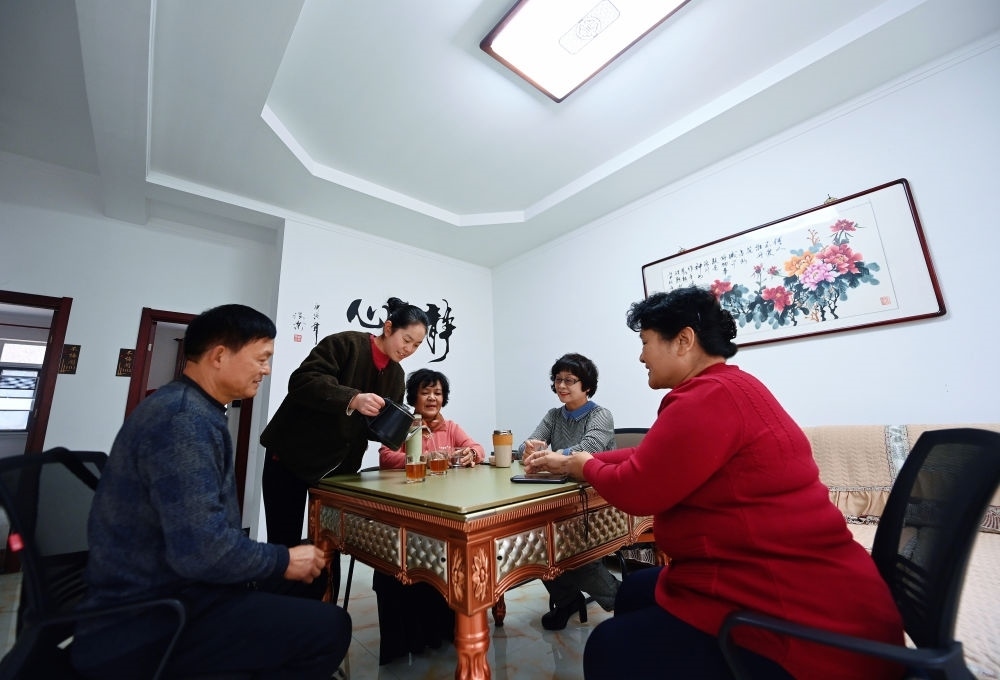 2024年1月30日,在天津市薊州區(qū)下營(yíng)鎮(zhèn)前干澗村,民宿經(jīng)營(yíng)者盧桂鳳為游客上茶水。新華社記者 趙子碩 攝