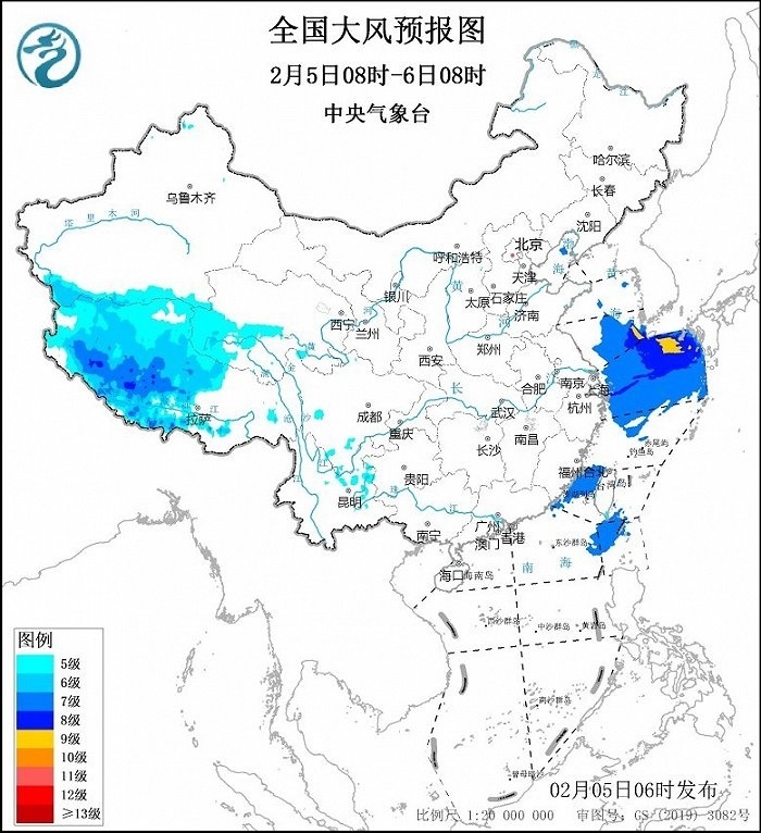預(yù)計(jì),2月5日08時(shí)至6日08時(shí),西藏中西部、青海西南部等地將有5~7級(jí)、陣風(fēng)8級(jí)的大風(fēng);黃海南部海域、東海大部海域、臺(tái)灣海峽、巴士海峽將有7~8級(jí)、陣風(fēng)9級(jí)的大風(fēng),其中黃海東南部、東海東北部的部分海域風(fēng)力可達(dá)9級(jí)、陣風(fēng)10級(jí)。