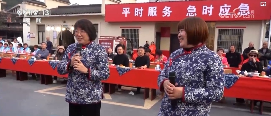 為了參加這次“村晚”,村里喜歡樂器的7個村民臨時組建了鑼鼓隊,每天積極練習(xí)。鼓聲一響,瞬間點燃了現(xiàn)場氣氛,上百人圍桌就餐看演出,年的味道就這樣來了。