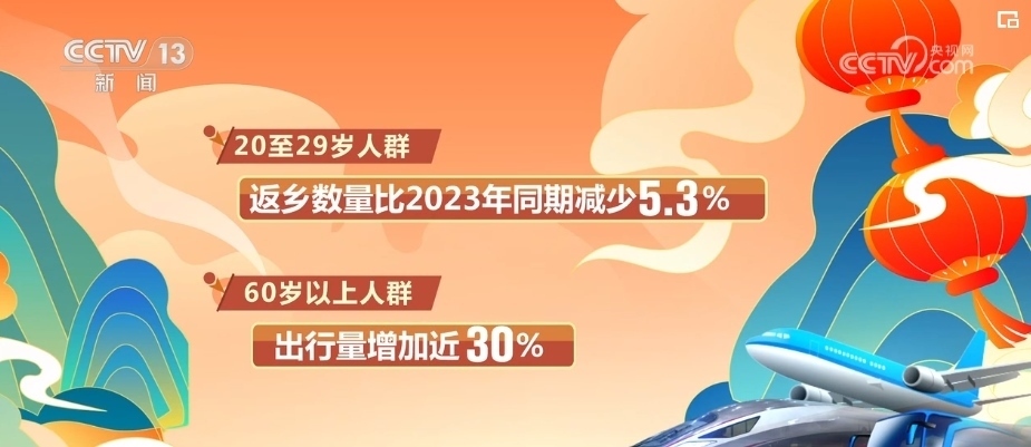 根據(jù)中國聯(lián)通智慧足跡對出行人群年齡的分析,2024年“反向春運”成為新趨勢。數(shù)據(jù)顯示,20歲—29歲人群的返鄉(xiāng)數(shù)量比2023年同期減少了5.3%,而60歲以上人群的出行量卻增加了近30%。