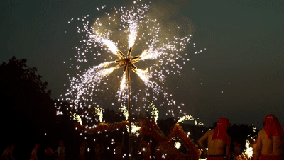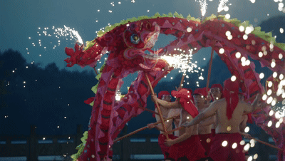 生龍活現(xiàn)(放煙花):登場的兩條龍,點燃提前放置的焰火筒,在龍珠的帶領下,形成“口中火”“脊上火”“腹中火”“導引火”的立體方陣,熱烈多彩。