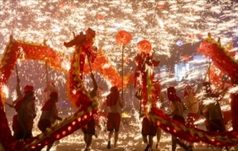 引龍出洞(火流星表演):舞龍人把燒紅的木炭放入小鐵籠中,系在長繩一端,他手握長繩,飛快地揮動繩子,使鐵籠和木炭在空中飛轉,流光溢彩,讓人挪不開眼。