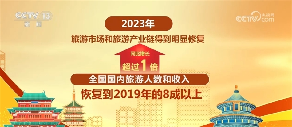 2023年,旅游市場和旅游產(chǎn)業(yè)鏈得到明顯修復(fù),全國國內(nèi)旅游人數(shù)和收入同比增長超過1倍,恢復(fù)到2019年的8成以上;入出境旅游人數(shù)超過1.9億人次,較上一年增長2.8倍以上。